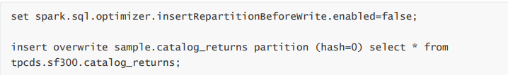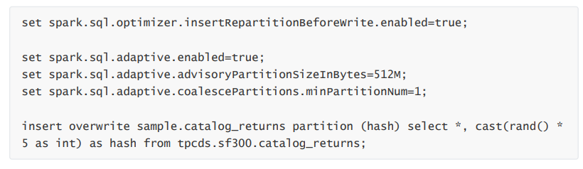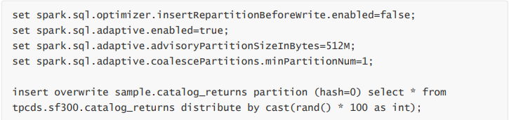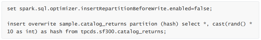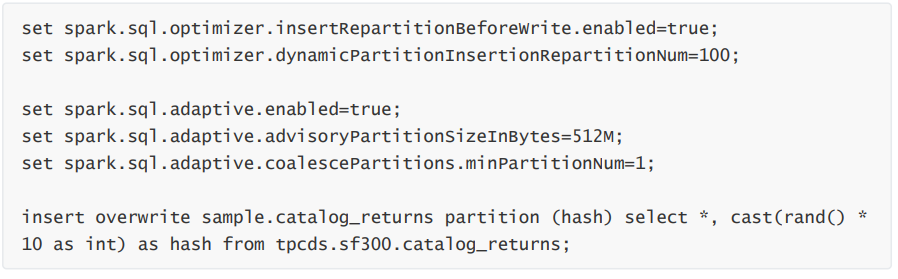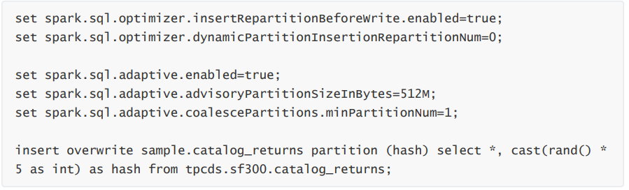对于动态分区写入,会根据动态分区字段进行 Repartition,并添加一个随机数来避免产生数据倾斜,spark.sql.optimizer.dynamicPartitionInsertionRepartitionNum 用来配置随机数的范围,不 过添加随机数后,由于加大了动态分区的基数,还是可能会导致小文件。这个操作类似在 SQL 中添加distribute by DYNAMIC_PARTITION_COLUMN, cast(rand() * 100 as int)。