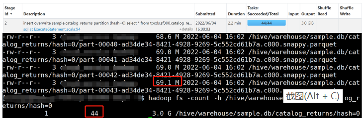 Spark SQL 最终产生的文件数最多可能是最后一个写入的 Stage 的 Task 数乘以动态分区的数量。我们 可以看到由于读取输入表的 Task 数是 44 个,所以最终产生了 44 个文件,每个文件大小约 69 M。