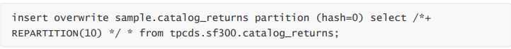 添加 REPARTITION(10) 后,会在读取后做一个 Repartition 操作,将 partition 数变成 10,所以最终 写入的文件数变成 10 个。