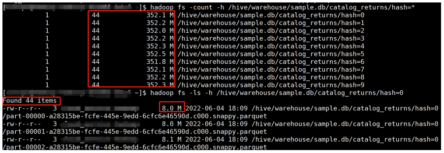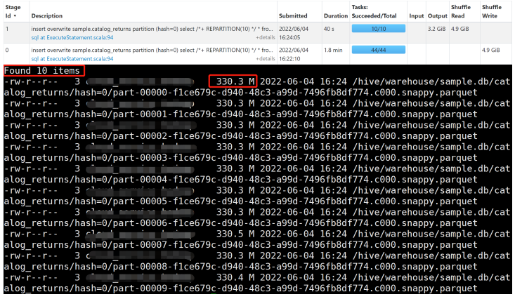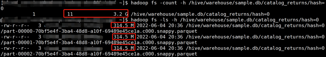 Repartition 操作自动合并了小分区,产生了 11 个文件,文件大小 334.6 M 左右,解决了小文件的问题。
