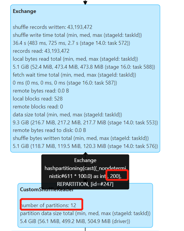 默认 Shuffle 分区数 spark.sql.shuffle.partitions=200 ,如果不开启 AQE 会产生 200 个小文件, 开启 AQE 后,会自动合并小分区,根据spark.sql.adaptive.advisoryPartitionSizeInBytes=512M 配置合并较小的分区,最终产生 12 个文件。