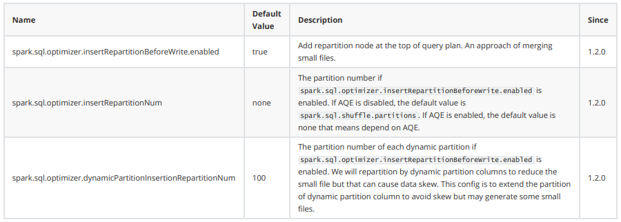 Kyuubi 提供了在写入前加上 Repartition 操作的优化,我们只需要将 kyuubi-extension-spark-3- 1_2.12-1.6.0-SNAPSHOT.jar 放入 Spark jars 目录中,并配置spark.sql.extensions=org.apache.kyuubi.sql.KyuubiSparkSQLExtension 。相关配置: