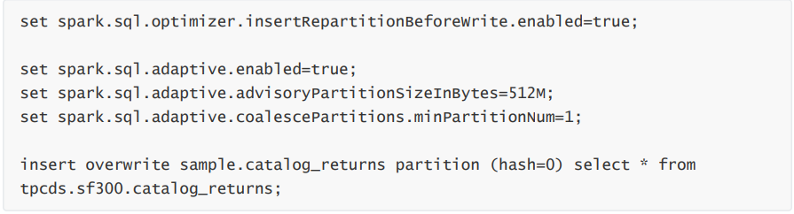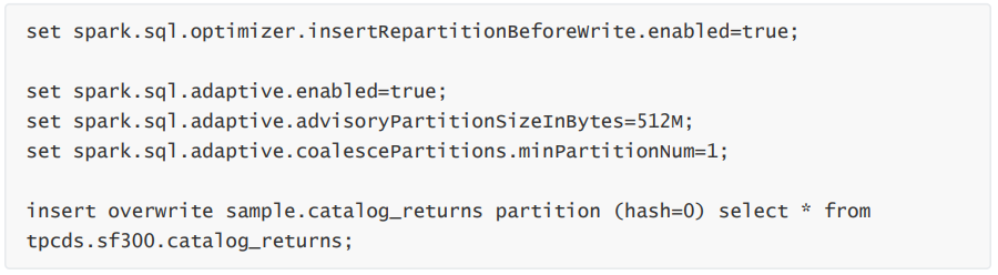 通过 spark.sql.optimizer.insertRepartitionNum 参数可以配置最终插入 Repartition 的分区数, 当不开启 AQE,默认为 spark.sql.shuffle.partitions 的值。需要注意,当我们设置此配置会导致 AQE 失效,所以开启 AQE 不建议设置此值。