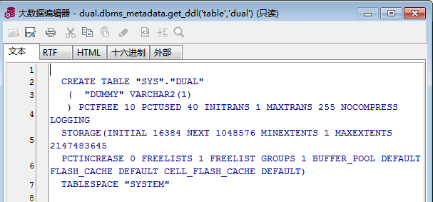 SELECT DBMS_METADATA.GET_DDL('TABLE','DUAL') FROM DUAL;