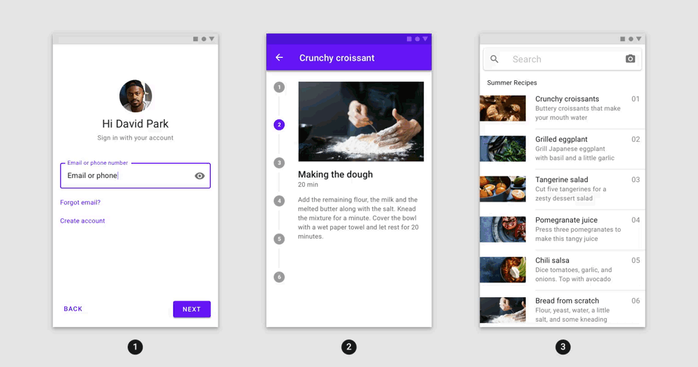Shared Axis:翻译过来是共享轴,适用于UI元素之间有空间或引导联系的场景,通过在x,y或z轴的转换,实现界面之间的联系来进行动画过渡。下面是实现的一些效果动图。