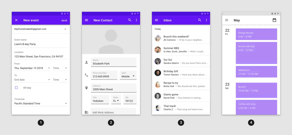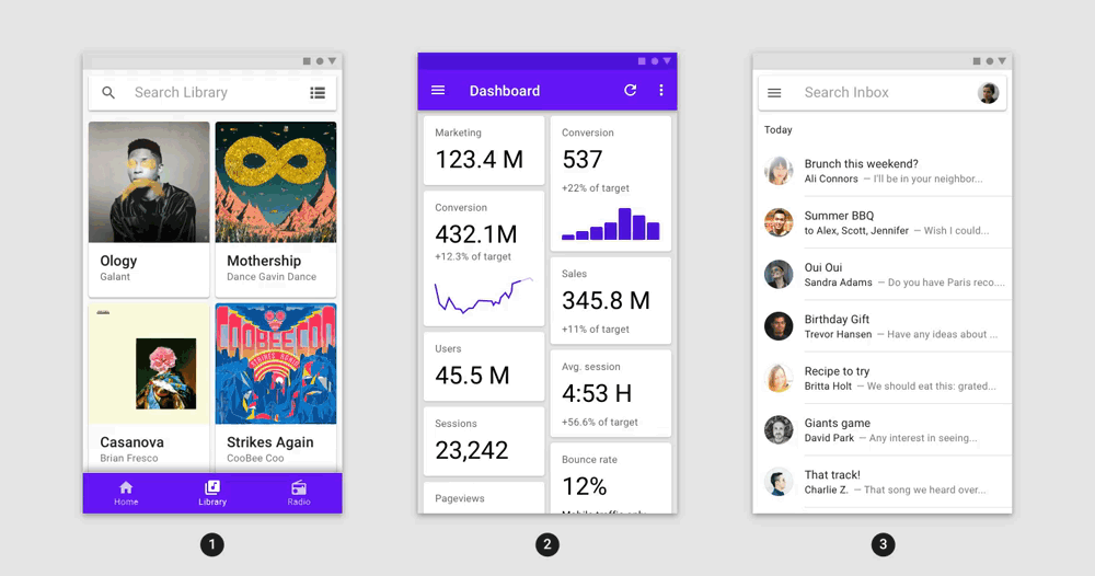 Container Transform:这种动效适用于一个元素在另一个容器中时的转场情况,将两个页面的元素联系使得转场更为平滑,有点类似Hero动画。下面是实现的一些效果的动图。