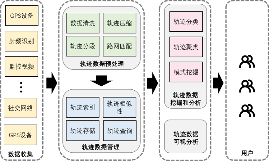 轨迹模式挖掘: 轨迹模式挖掘常通过对移动对象的跟踪和分析,获取轨迹数据中移动对象的移动模式,获取轨迹的特征和规律。常见的轨迹模式挖掘包括了周期模式、伴随模式、语义模式和频繁模式等[27]。