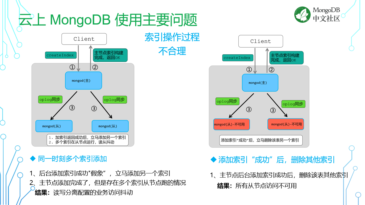 以副本集添加索引为例,createIndex 创建索引成功实际上在主节点成功后就返回了,从节点还没有添加索引成功。如果用户做了读写分离,并且从节点压力比较大,这时候可能从节点执行索引时间会更长,如果用户主节点执行成功后,createindex 返回立马又添加其他索引,这时候可能存在多个索引在从节点执行的情况,这样从节点压力会很大。