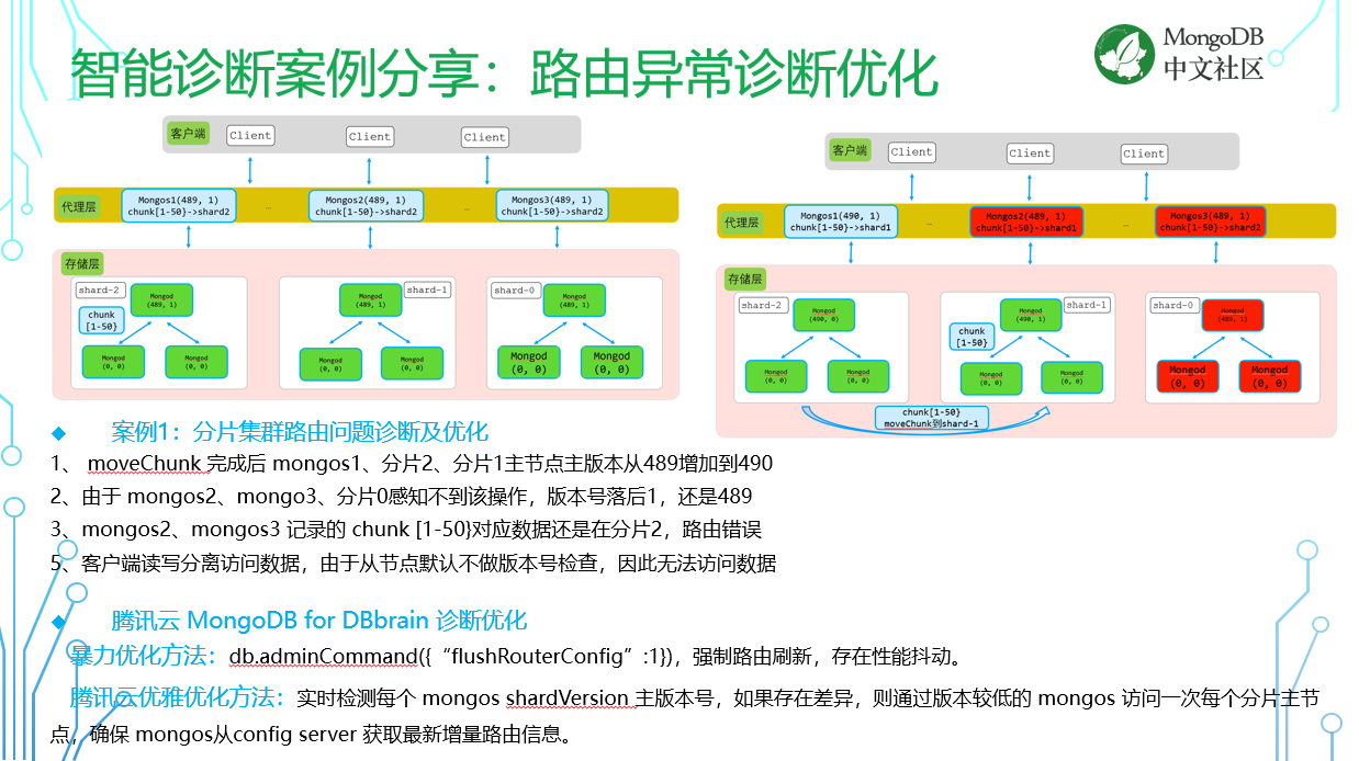 暴力优化方法:db.adminCommand({“flushRouterConfig”:1}) ,强制路由刷新,存在性能抖动。该操作会情况内存缓存的所有路由信息,新请求进来后需要从 config server 获取所有 chunks 信息加载到本地内存,如果 chunks 较多,整个过程 mongos 访问不可用。