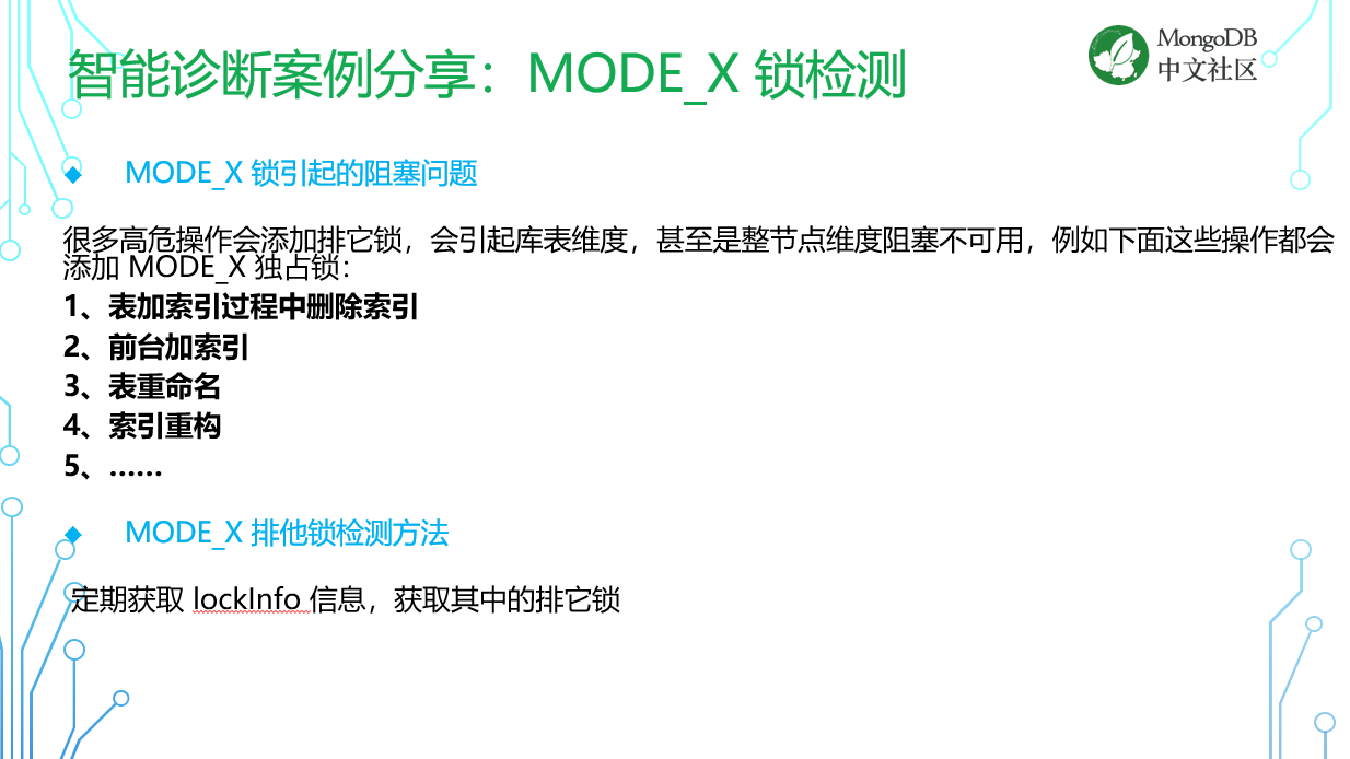 很多高危操作会添加排它锁,会引起库表维度,甚至是整节点维度阻塞不可用,例如下面这些操作都会添加 MODE_X 独占锁: