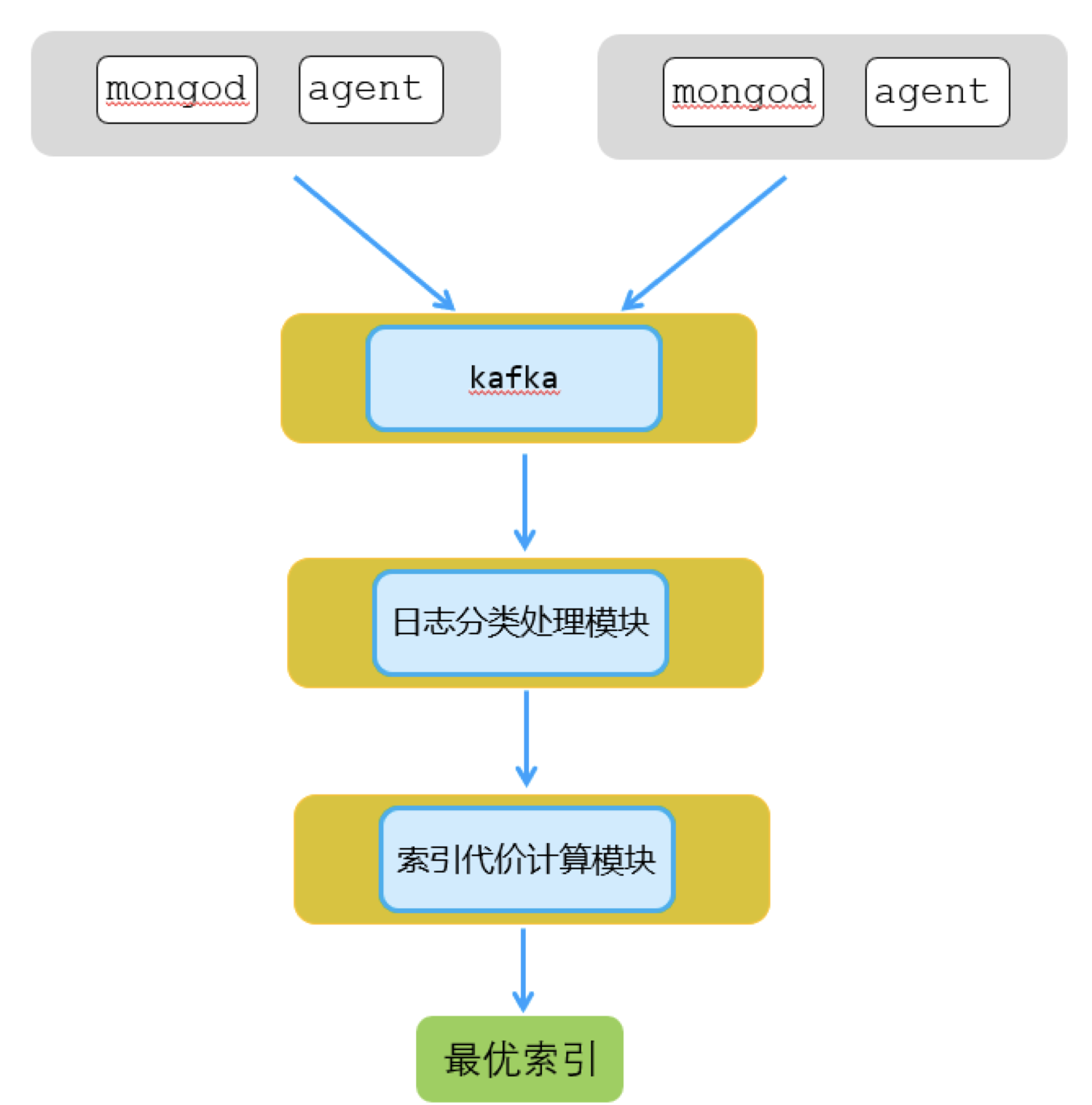 代价估算模块:模拟 MongoDB 内核执行计划过程,进行候选索引代价估算。系统整体的工作流程如下:每个 MongoDB 节点上布署有 agent 节点,它会实时采集所有有用的日志并存储到 Kafka 里,日志分类处理模块会从 Kafka 里把需要的日志提取出来进行分类,然后把分类好的日志交给索引代价计算模块进行计算,最终得到最优索引。
