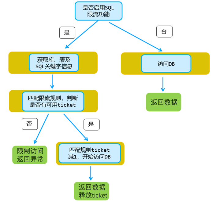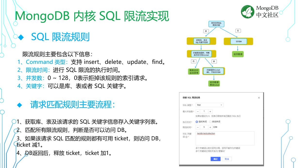 当一个请求到达 MongoDB 后,具体的处理流程是,先看这个实例是否启用了 SQL 限流功能,如果已启用,则提取用户请求中的库、表和 SQL 关键字信息,下一步和配置的限流规则做匹配,判断这类 SQL 是否有可用的 ticket。