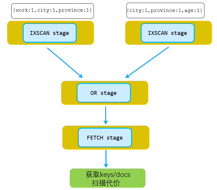 上面的候选索引对应的执行计划流程是:如果查询选择该候选索引执行,其执行计划首先进入 index scan stage,然后进入 OR stage,OR stage 执行完成后就会开始做fetch操作,最后就会得出整个流程扫描了多少行数据、得到了多少行数据,以及整个流程的执行时间。