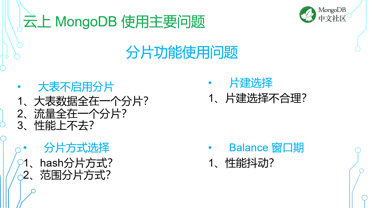 云上分片集群经常遇到的问题如上,主要包括大表不启用分片、分片方式不是最优、片建选择不当、高峰期没有设置 balance 窗口集群抖动。