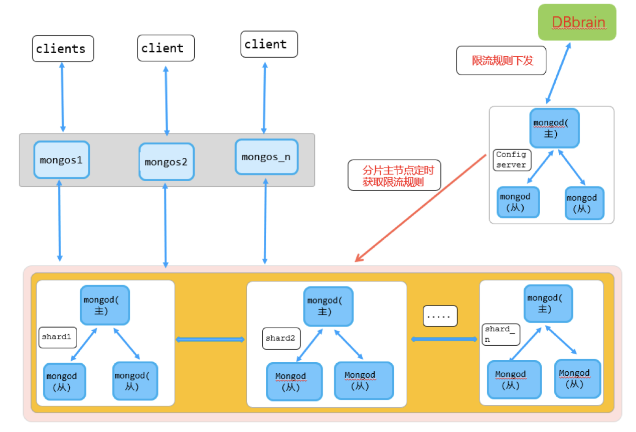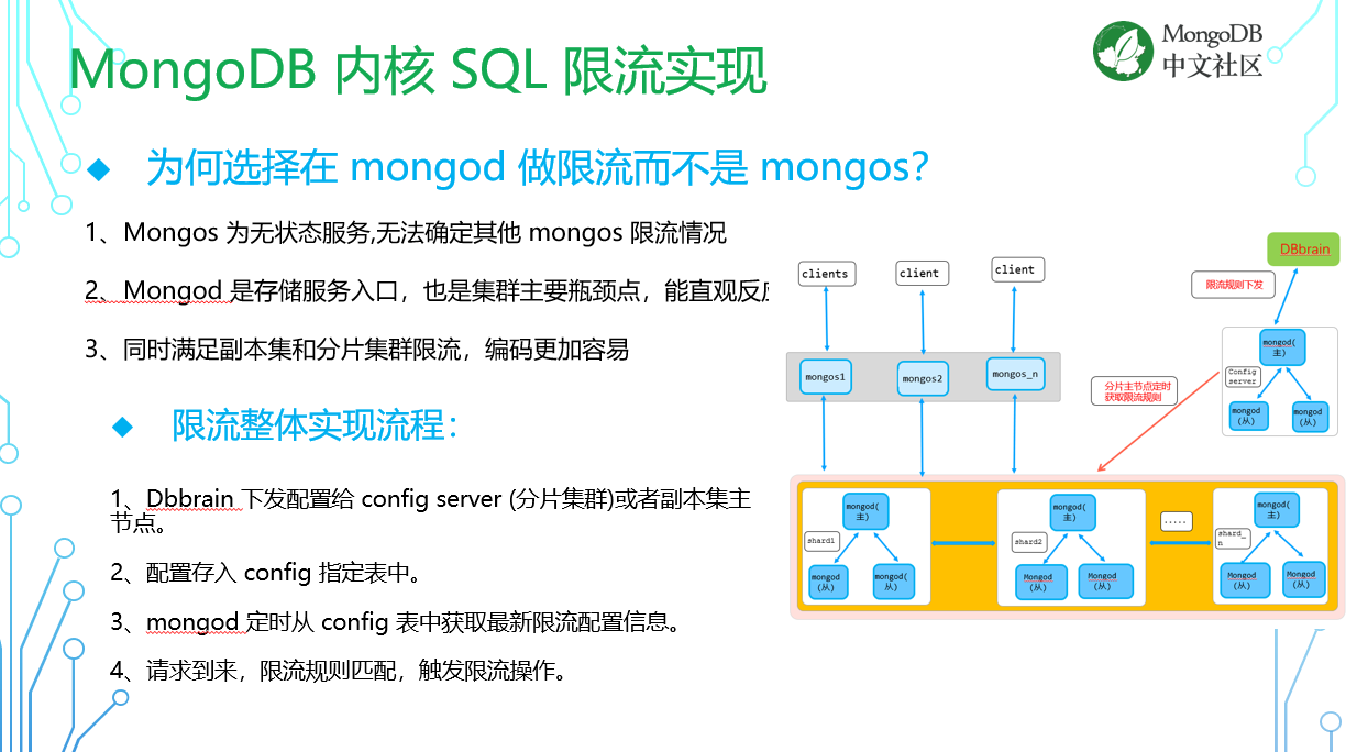 然后,是根据读写 SQL 关键字,配置完规则,就可以对指定库、表或者指定的 SQL 语句做限流。整个流程是首先在 DBbrain 的控制台下发规则,以分片集群为例,就下发给分片集群的 config server,config server 接收到后把这个规则写到 config server 的一个表里,shard server 的每个 mongod 定期从 config server 获取这些规则并加载到自己内存里,所有的 mongod 节点内存里就会有完整的规则数据存在,当发起一个请求,通过客户端到代理,再到 mongod 节点的时候,进行限流规则匹配,触发限流操作。