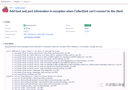 其实,很容易知道是网络有问题。不过,Flink1.12.2版本这部分的异常日志太笼统,社区有相关issue进行优化,最起码打印出来具体的IP和port。