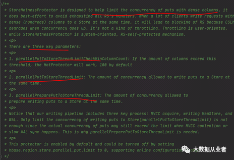 分析:通过撸HBase源码发现,RegionTooBusyException是StoreHotnessProtector类抛出的。StoreHotnessProtector类很有意思,是HBase用于限制热点数据的,如图: