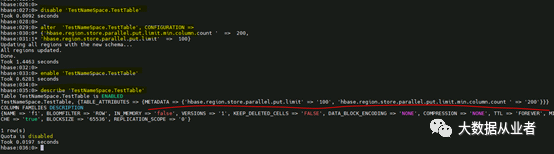 1. disable 'TestNameSpace.TestTable'2. alter 'TestNameSpace.TestTable', CONFIGURATION => {'hbase.region.store.parallel.put.limit.min.column.count ' => 200, 'hbase.region.store.parallel.put.limit' => 100}3. enable 'TestNameSpace.TestTable'