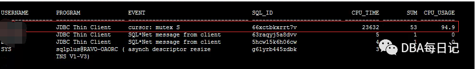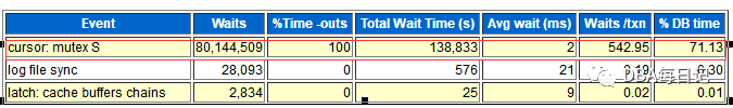 EVENT事件 为 cursor:mutex S (这里做个标记) 某个进程以SHRD S mode申请一个Mutex, 而该Mutex要么被其他进程已EXCL X mode所持有,要么其他进程正在更新mutex 上的Ref Count。