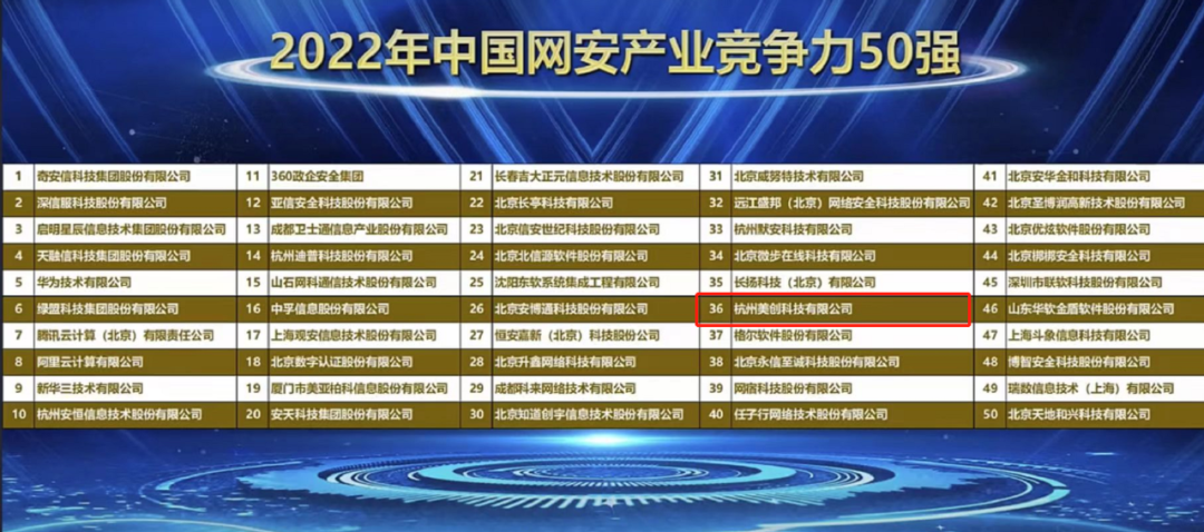 2022年6月23日,由中国网络安全产业联盟(CCIA)发起,数说安全提供研究支持的 “2022年CCIA中国网络安全竞争力50强”(以下简称“CCIA 50强”)正式发布。凭借在数据安全领域的领先优势,美创科技再次入选,综合排名第36。