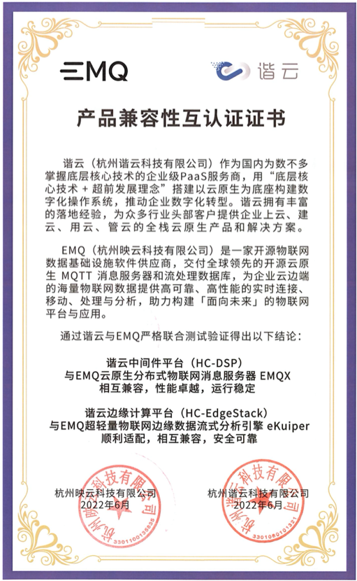 近日,谐云科技有限公司与 EMQ 映云科技完成多个产品兼容性测试认证,产品覆盖谐云中间件平台(HC-DSP)和云原生分布式物联网消息服务器 EMQX,以及谐云边缘计算平台(HC-EdgeStack)和超轻量物联网边缘数据流式分析引擎 eKuiper。
