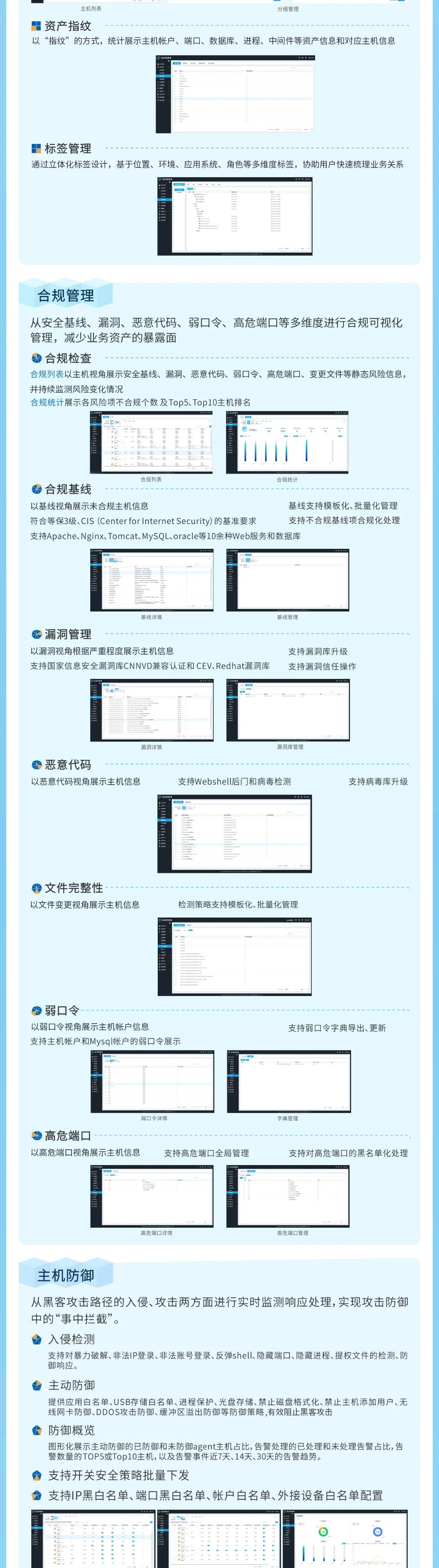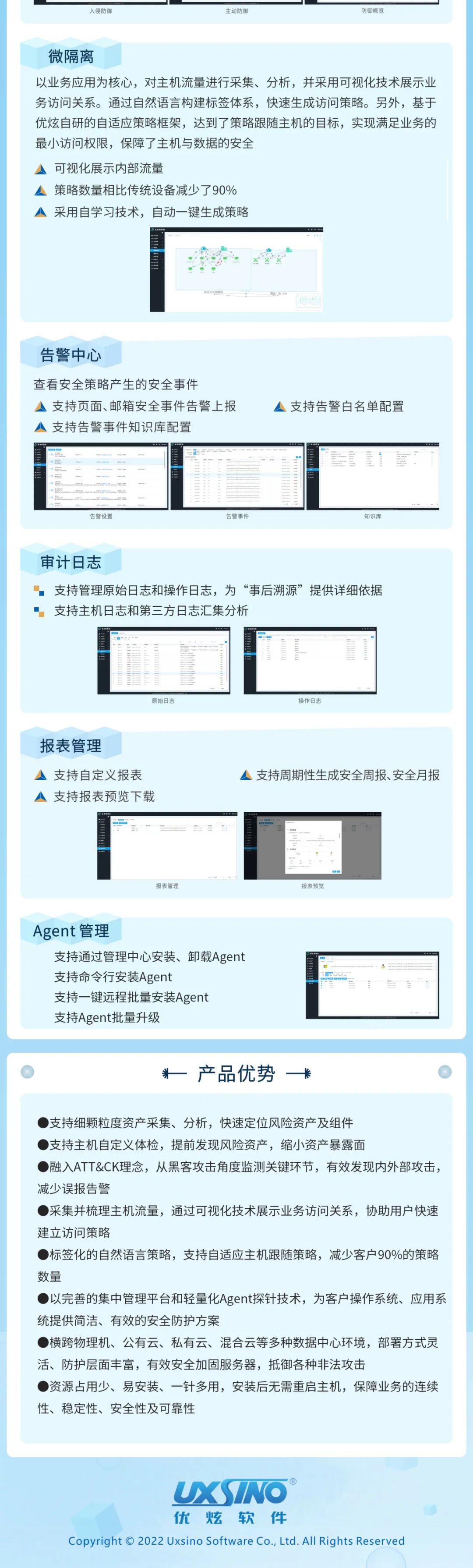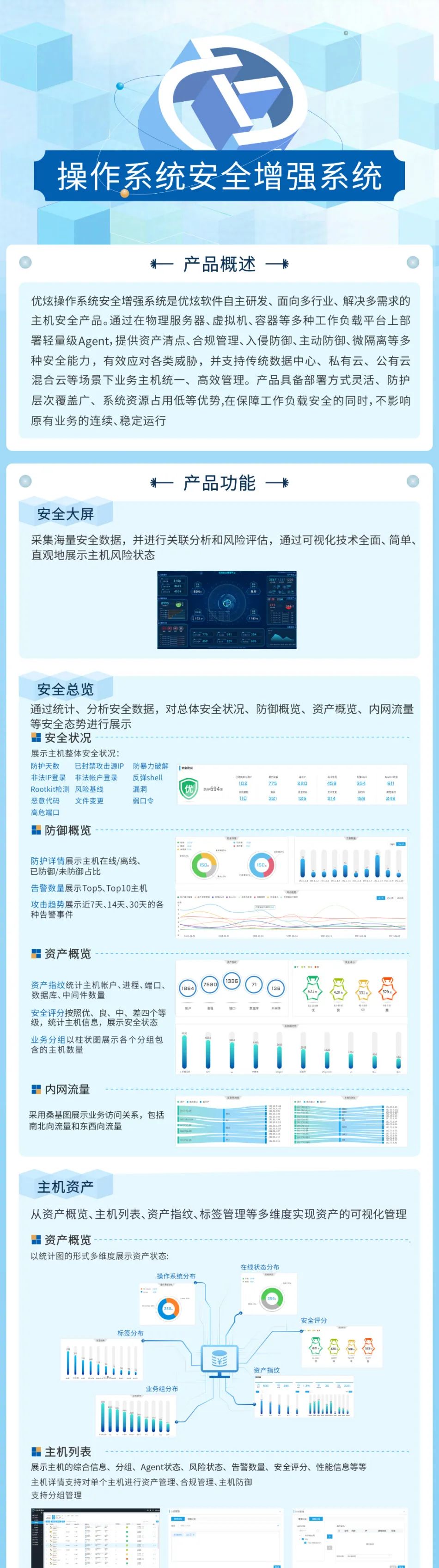 “优炫操作系统安全增强系统”是面向多行业、解决多需求的关键信息基础资源安全防护产品,采用内核防御技术,提供安全基线检测与修复、操作系统访问控制管理、应用程序可信验证、系统漏洞管理、攻击防御等功能,能够免疫对服务器操作系统和应用系统的攻击,从而提升主机安全。