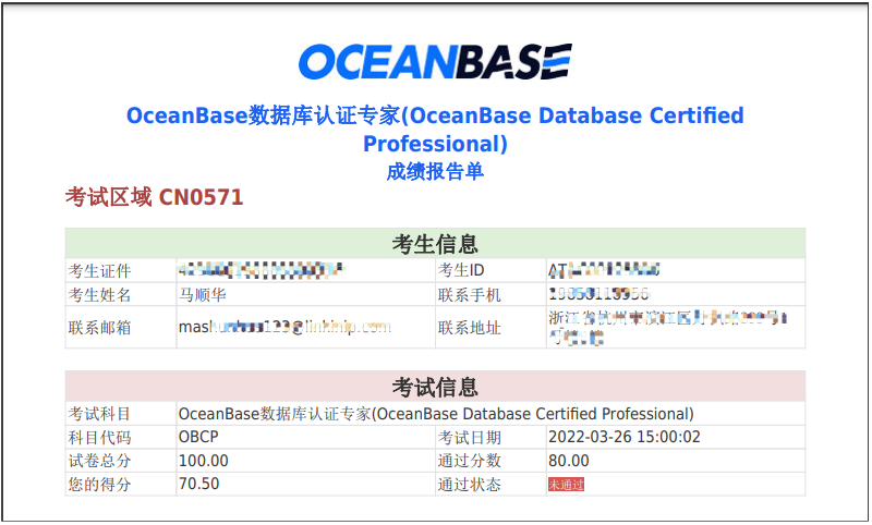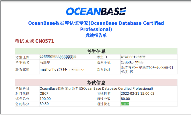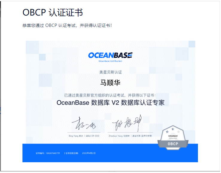 2022年03月31日:第二次报名参加OceanBase OBCP中级认证考试,获得认证OBCP证书。