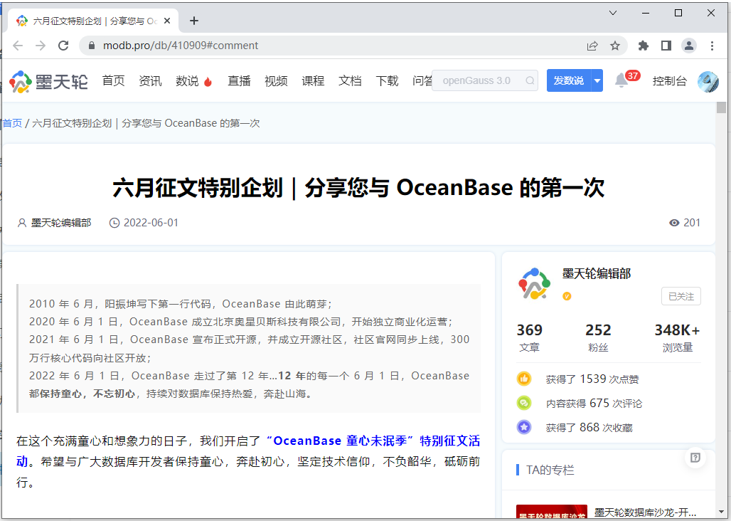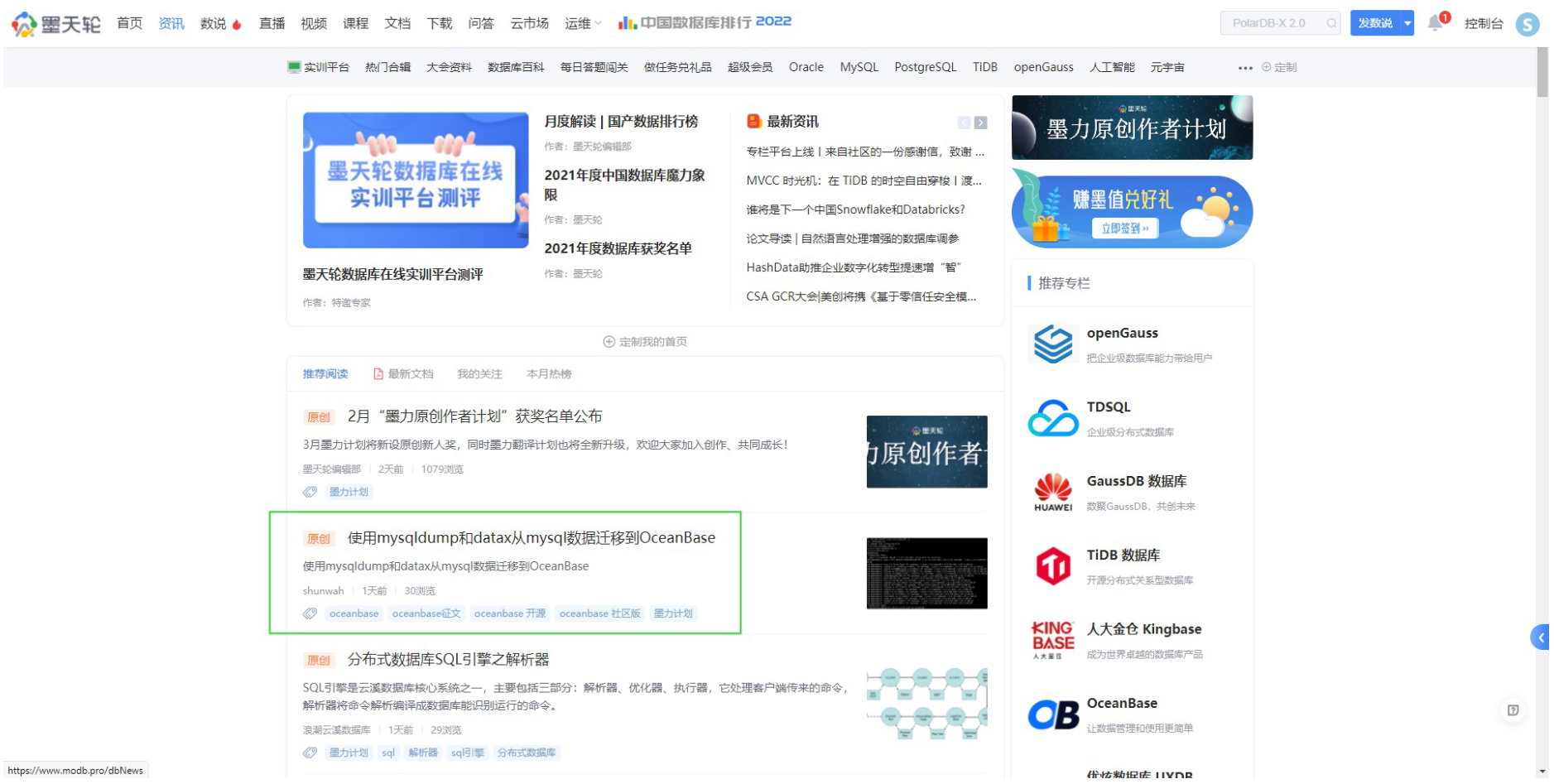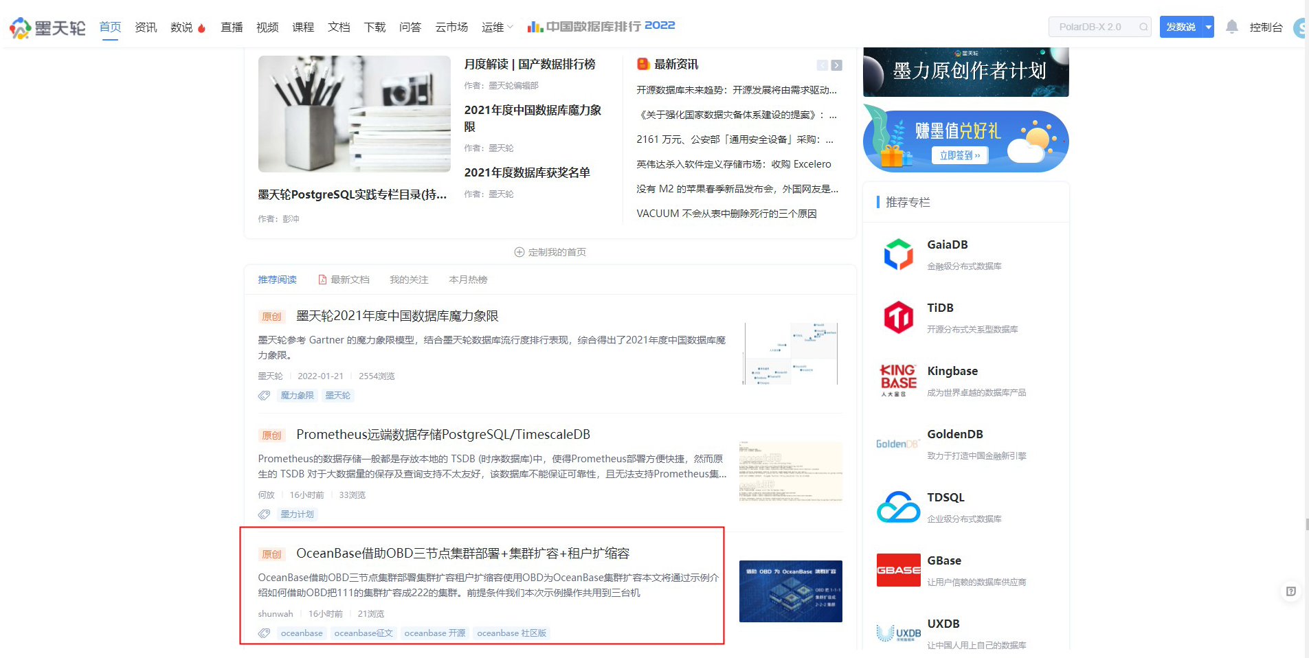 Step1: 文章在 墨天轮社区 首发,并添加标签 #OceanBase 征文 发布。
