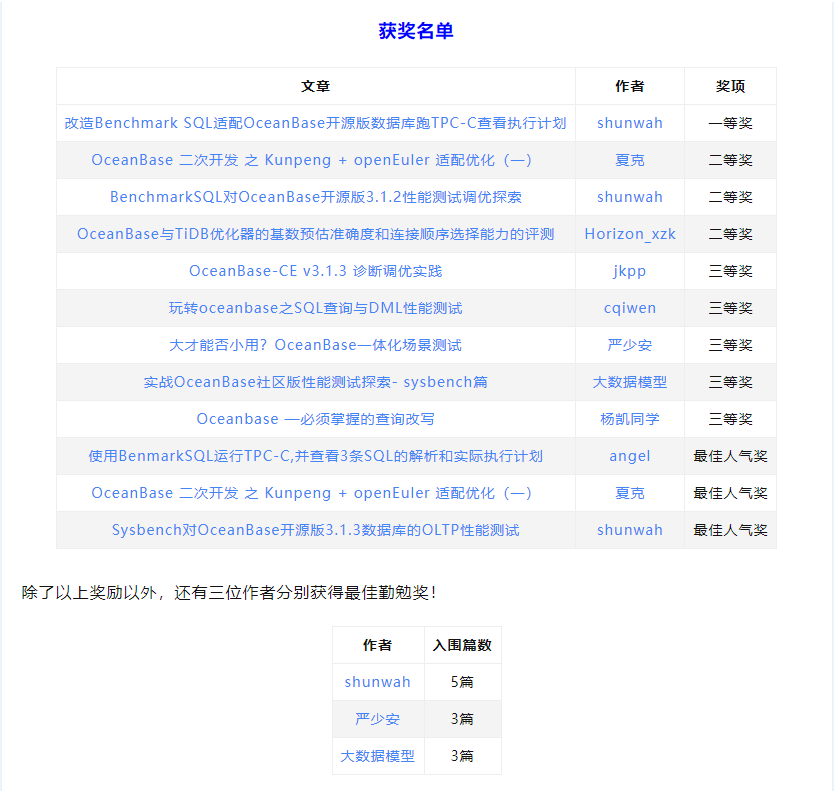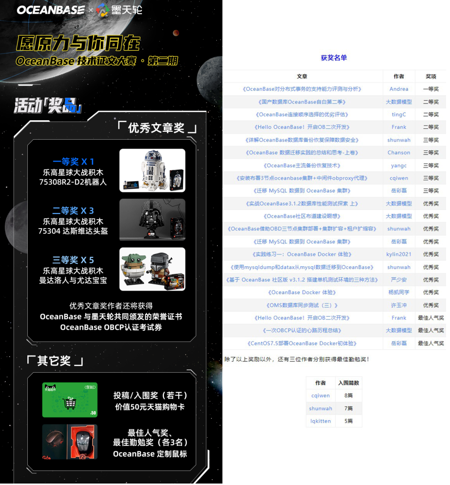 本期征文结束后,评优结果将第一时间在墨天轮社区、OceanBase 微信公众号公布。