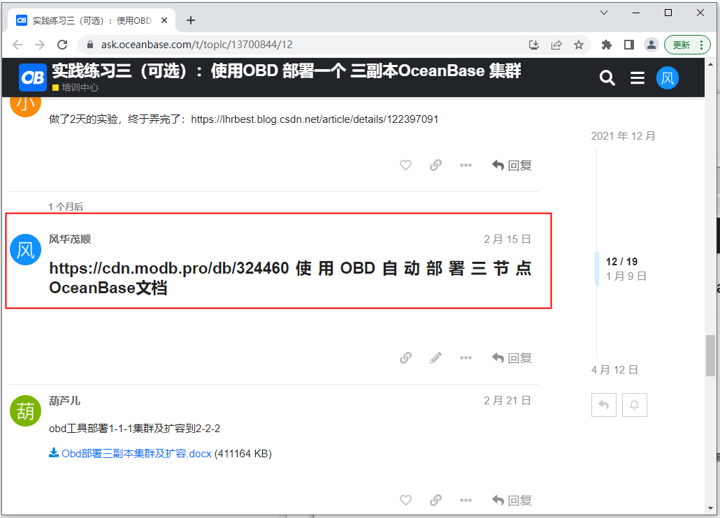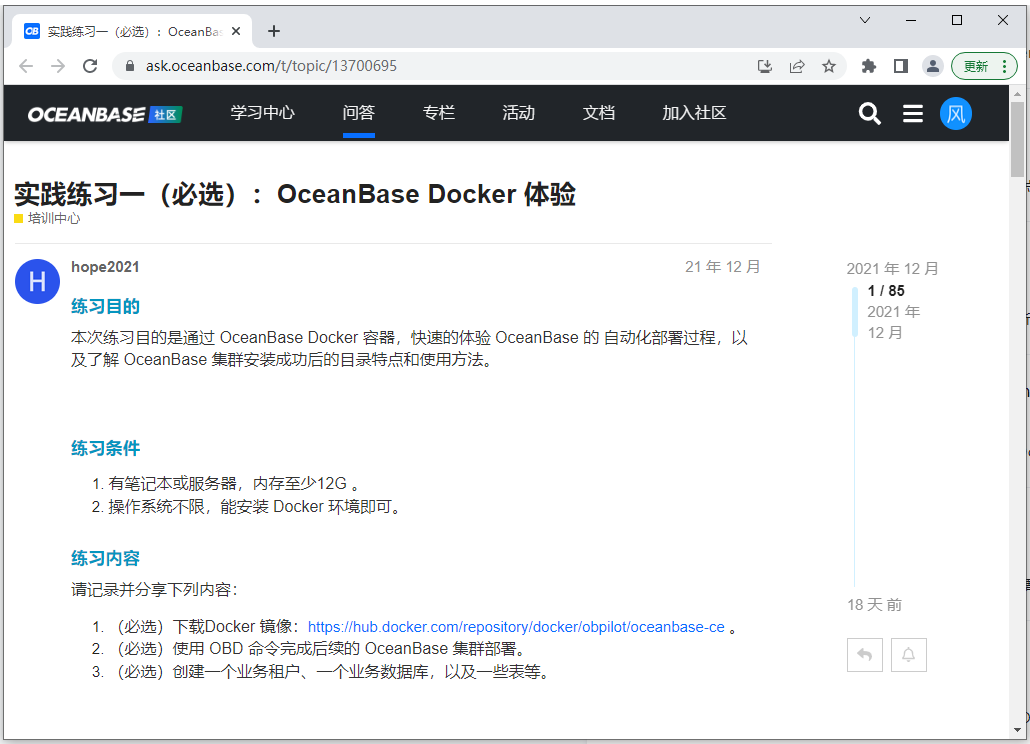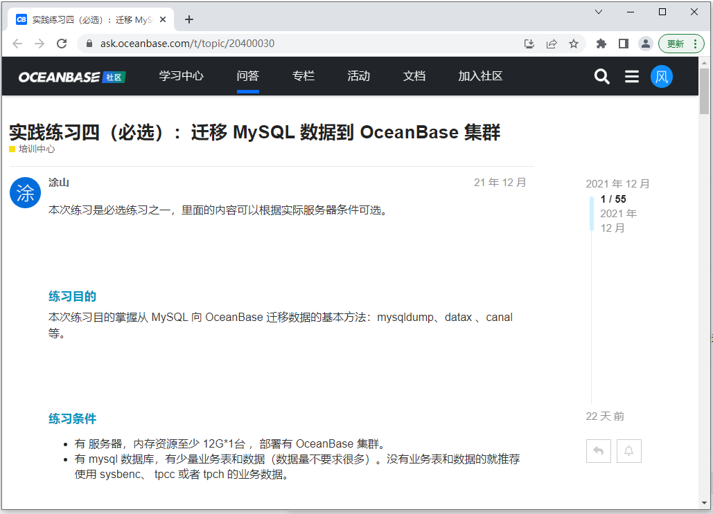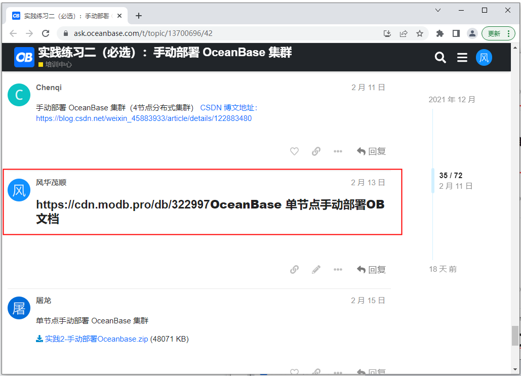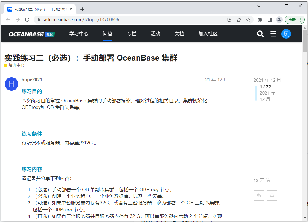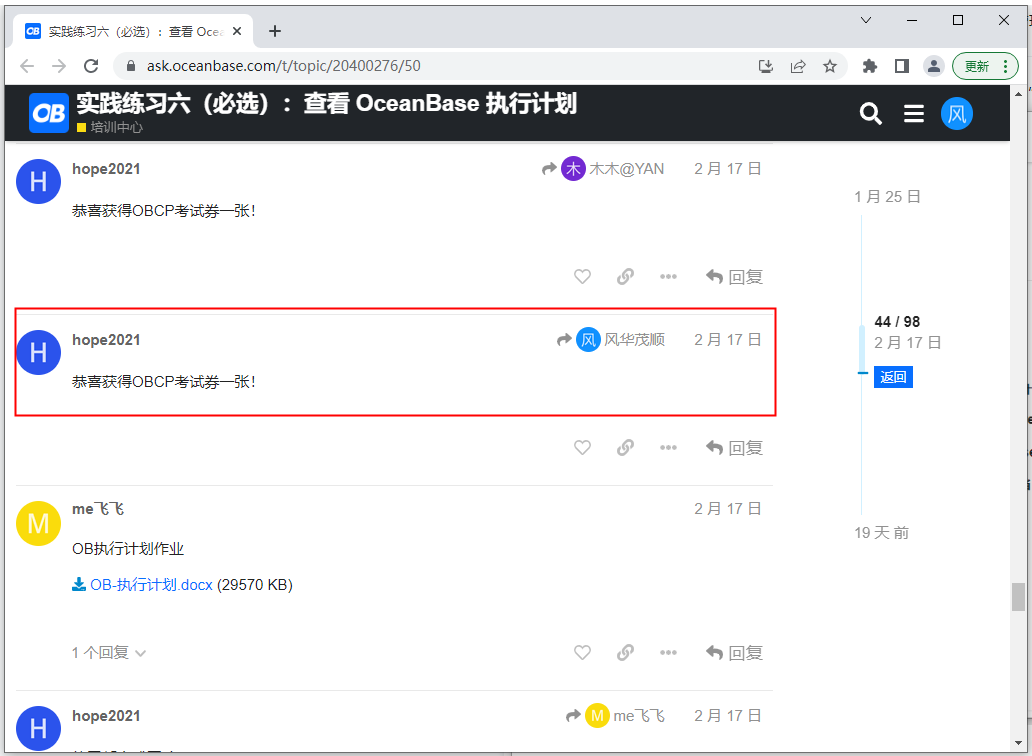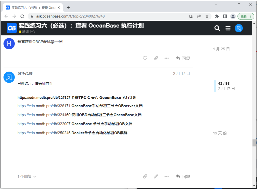 2022年02月17日:完成OceanBase 入门到实战教程总必选的 4 个练习,并获得OBCP考试券一张!