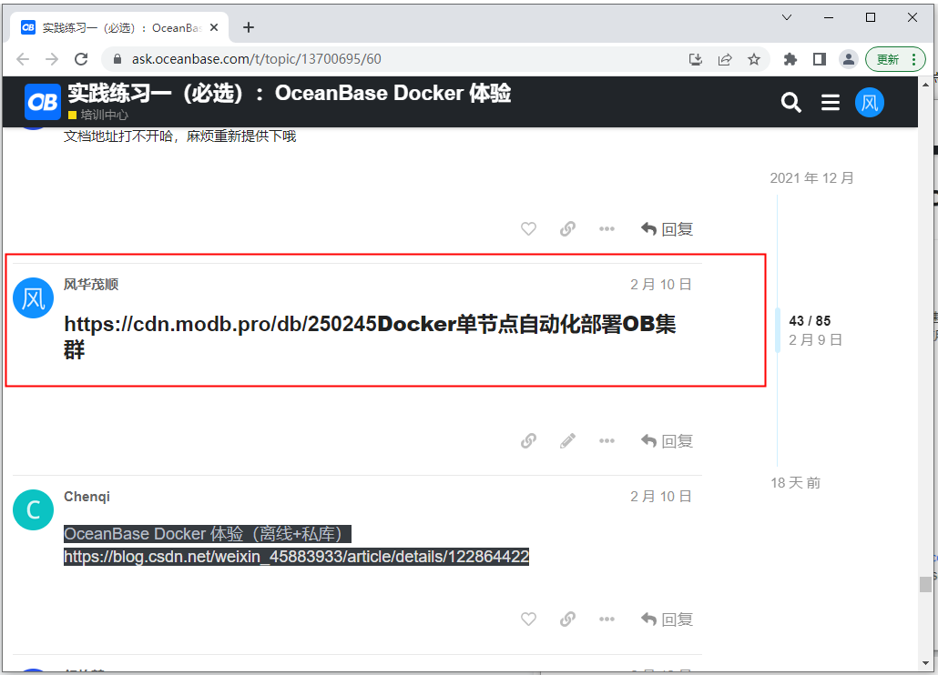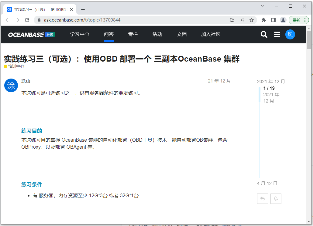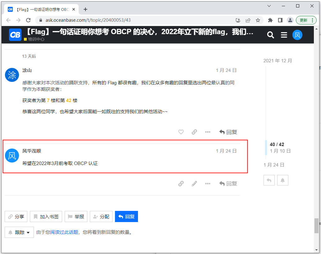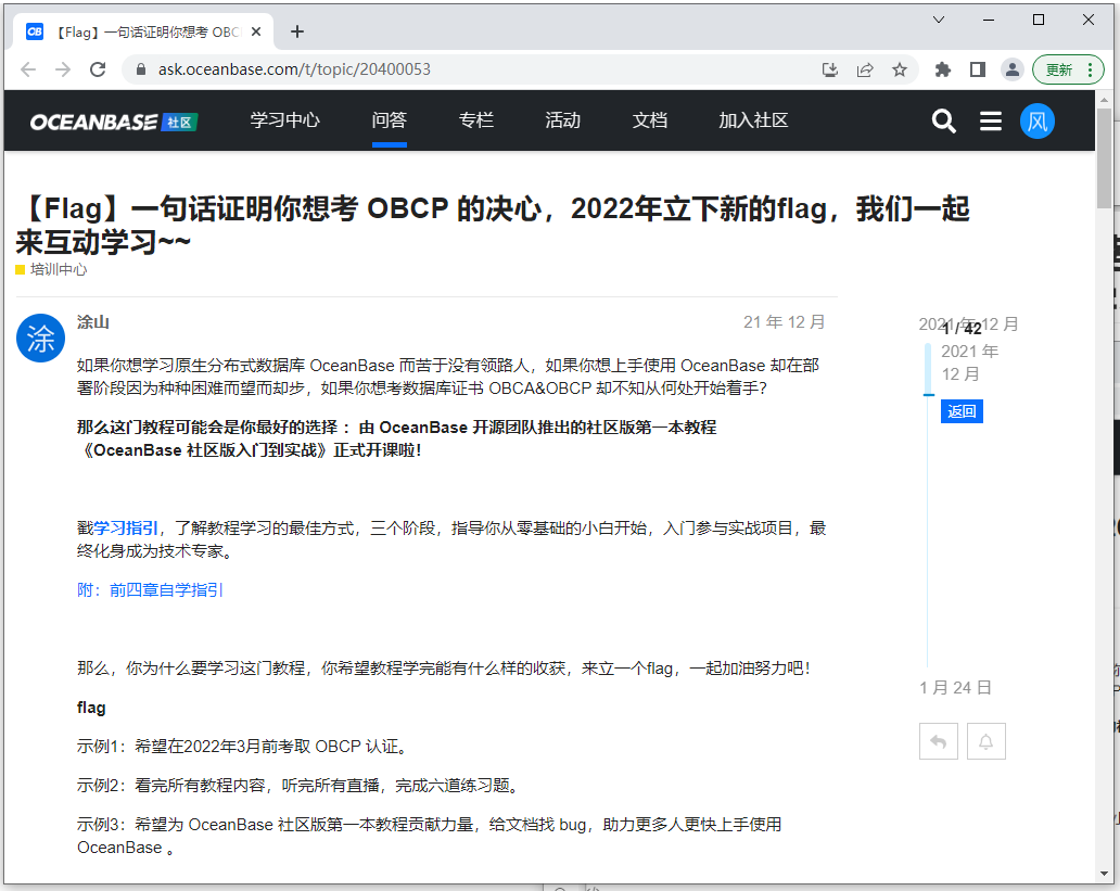 2022年01月05日:第一次在OB官方社区“问答”板块留言。