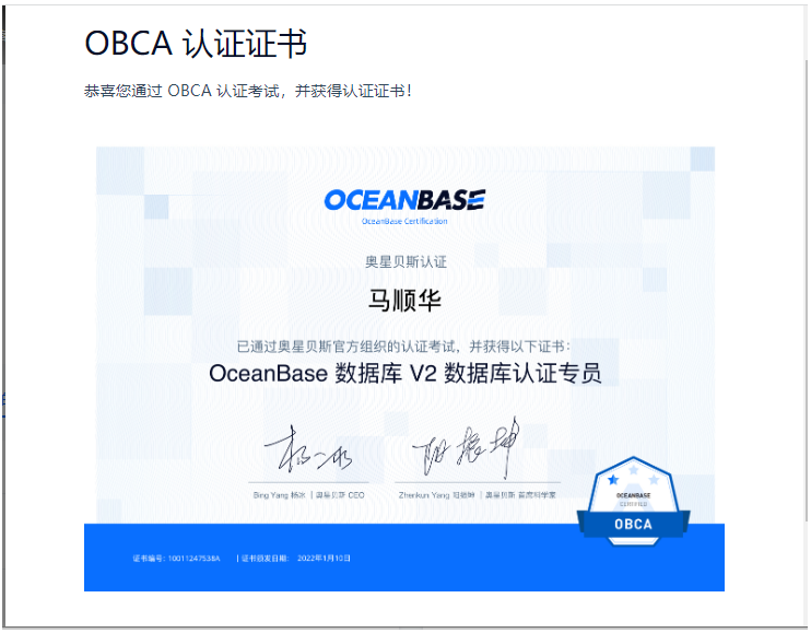 2022年01月07日:报名参加OceanBase OBCA初级认证考试,获得认证OBCA证书。