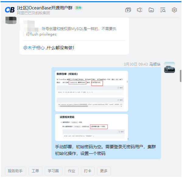 刚开始加入OB社区,我就被社区的工作人员“盯”上了,他们先是很耐心地给我介绍 OceanBase 社区,然后带我找到组织:OceanBase 官方群。刚入 OceanBase 社区的同学,我建议你一定要加群。因为很多问题,你发到群里,能更高效地解决。带我了解 OceanBase 社区之后,社区工作人员再三叮嘱我,畅游社区,有任何不好的体验,要马上反馈,他们一定会尽快解决。我这样一个“小透明”,突然被社区工作者众星拱月般的对待,着实有点受宠若惊!这份宠爱,独一无二。