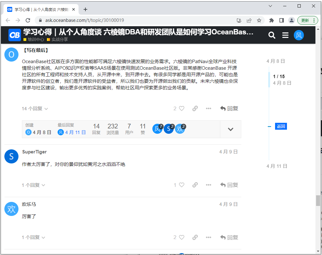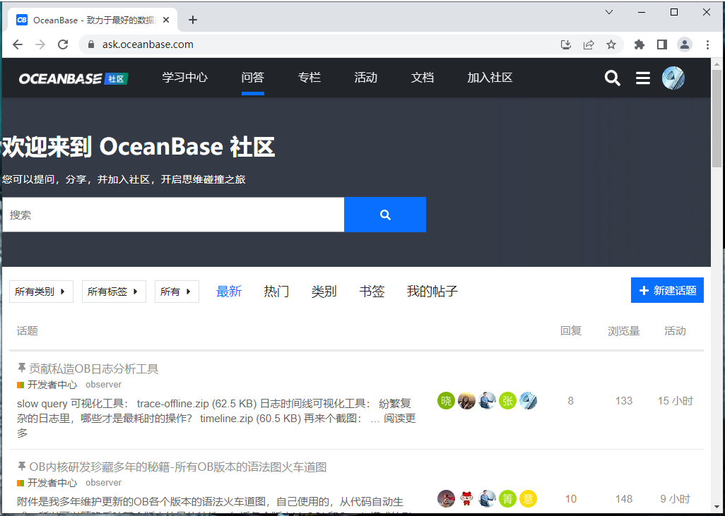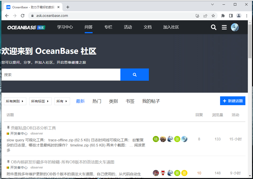 OB开源团队老师和同学非常乐于跟用户交流OB技术。OceanBase 的社区问答是我非常喜欢的板块,因为不论你提的问题是初级的问题,还是高级的问题,都会得到很反馈。你可以在OceanBase 社区问答板块提问、分享、查找之前别人遇到过的问题?另外,你的认真解答,也会被很多人认可。在寻求帮助的过程中, 也不断的锻炼自己, 让自己的知识越来越丰富。