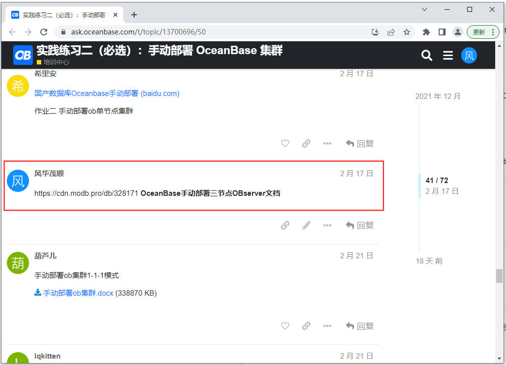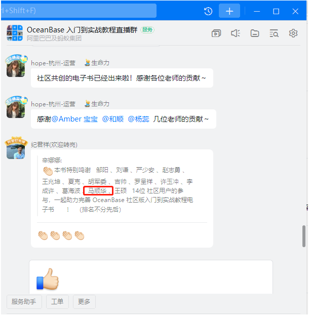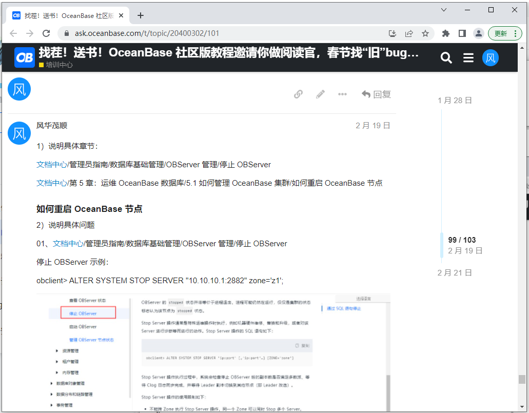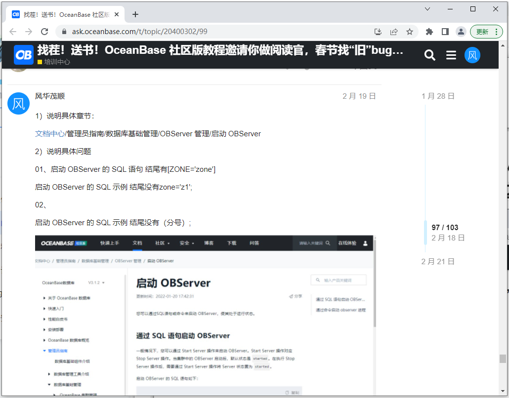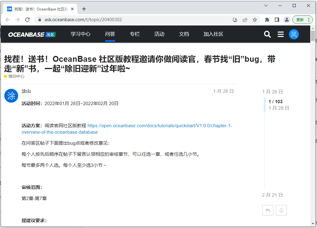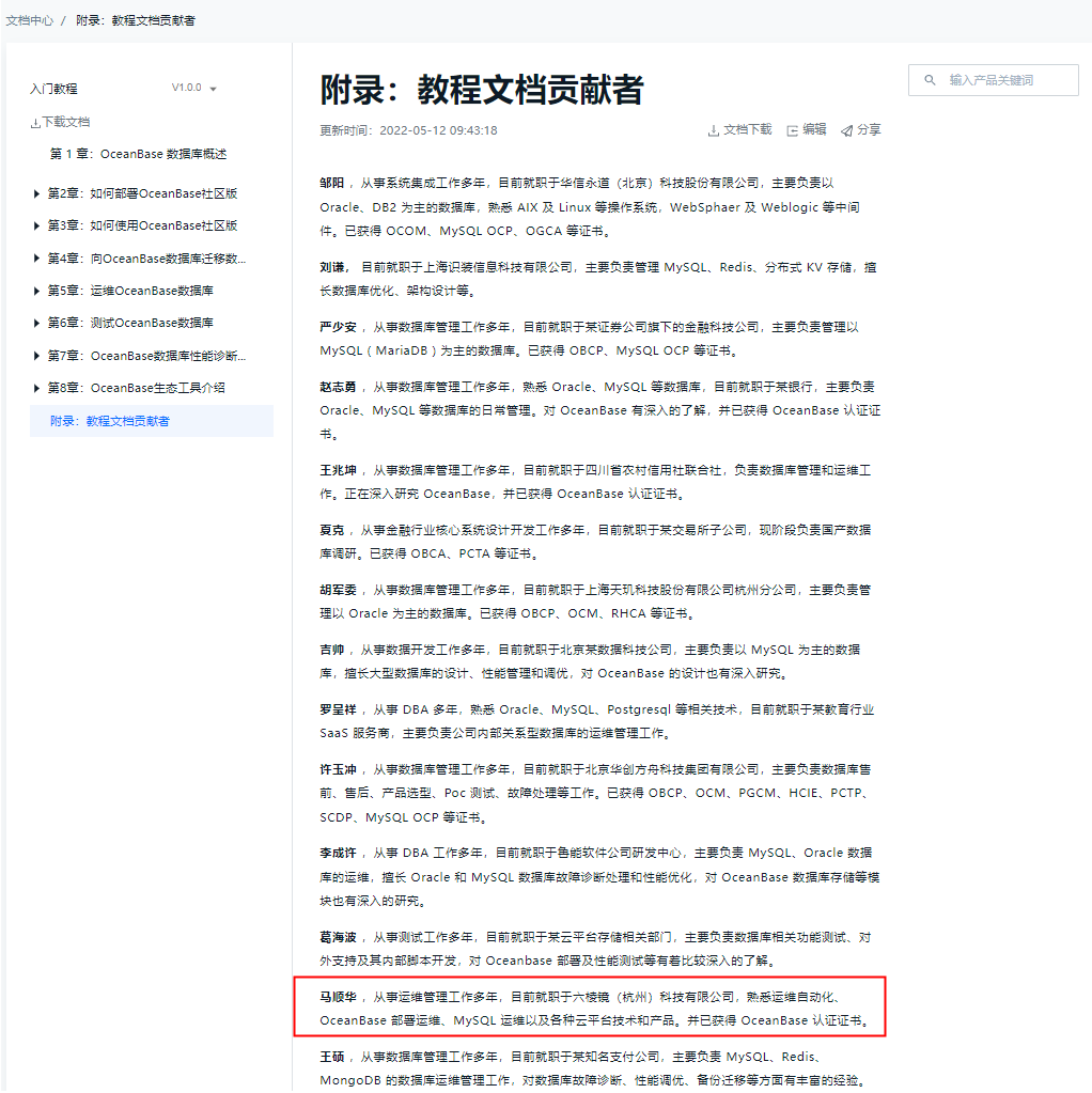 2022年02月19日:第一次参加OceanBase 社区版[找茬!送书!OceanBase 社区版教程邀请你做阅读官,春节找“旧”bug,带走“新”书,一起“除旧迎新”过年啦~]活动,附录:教程文档贡献者 本人是其中一位贡献者 。