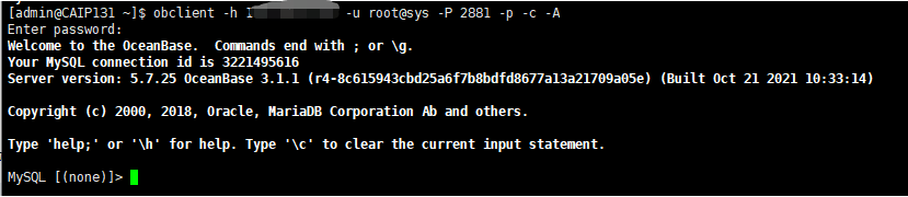[admin@CAIP131 ~]$ obclient -h 112.127.2.120 -u root -P 2881 -p -c -A