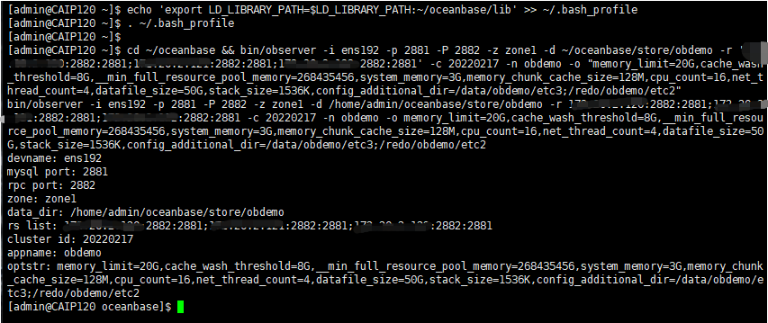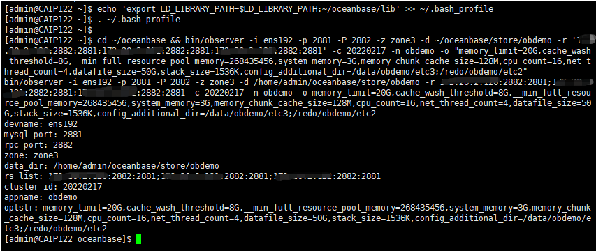 cd ~/oceanbase && bin/observer -i ens192 -p 2881 -P 2882 -z zone1 -d ~/oceanbase/store/obdemo -r '112.127.2.120:2882:2881;112.127.2.121:2882:2881;112.127.2.122:2882:2881' -c 20220217 -n obdemo -o "memory_limit=20G,cache_wash_threshold=8G,__min_full_resource_pool_memory=268435456,system_memory=3G,memory_chunk_cache_size=128M,cpu_count=16,net_thread_count=4,datafile_size=50G,stack_size=1536K,config_additional_dir=/data/obdemo/etc3;/redo/obdemo/etc2"