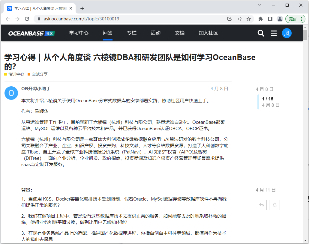 2022年04月08日:第一次在社区分享学习OB的心得【学习心得|从个人角度谈 六棱镜DBA和研发团队是如何学习OceanBase的?】