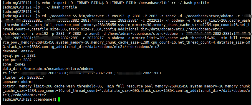 cd ~/oceanbase && bin/observer -i ens192 -p 2881 -P 2882 -z zone2 -d ~/oceanbase/store/obdemo -r '112.127.2.120:2882:2881;112.127.2.121:2882:2881;112.127.2.122:2882:2881' -c 20220217 -n obdemo -o "memory_limit=20G,cache_wash_threshold=8G,__min_full_resource_pool_memory=268435456,system_memory=3G,memory_chunk_cache_size=128M,cpu_count=16,net_thread_count=4,datafile_size=50G,stack_size=1536K,config_additional_dir=/data/obdemo/etc3;/redo/obdemo/etc2"