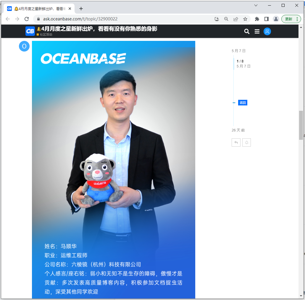如今,不管是通勤路上,还是饭后休息,只要一有时间,我就会进入 OceanBase 社区,看看有没有新的问题是我能解决的,看看有没有新的回答是能够帮助到我的。然后再去 OceanBase 社群,跟一帮素未谋面的“老朋友们”聊聊天。就这样,每天都过的很充实。仔细想来,我从去年开始,了解 OceanBase,熟悉 OceanBase,然后加入 OceanBase 社区,参与社区各种活动,跟社区的各种大佬、小白互动······直至今日,成为 OceanBase的社区之星,我的生活,OceanBase已经占了大头。