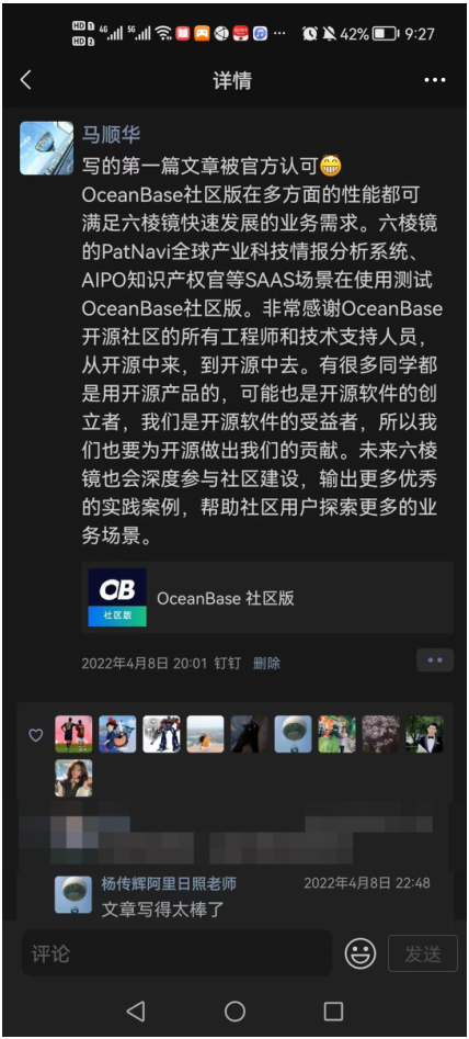 他们了解 OceanBase ,主要是因为我在微信群、朋友圈等社交阵地,“不遗余力”的推广我在 OceanBase 社区发表的文章。这些文章既有我学习、实践 OceanBase 的成果,也有我为别人答疑解惑的“智慧之光”。我很愿意把这些分享给我的家人、朋友。我不在乎这些文章他们能不能看懂,也不在乎对他们有没有帮助。我只是单纯的想跟他们分享我的生活,想让他们知道,我在学习数据库,我在了解国产数据库。