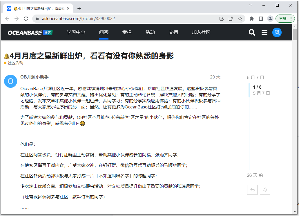 OceanBase社区是大家共同的社区,在这个大家庭了,只要你积极参与,互帮互助,都是咱们的月度之星,因为你的点滴付出,都被社区铭记下来,靠实力赢得大家的尊重。OB开源社区是大家的社区,因为有你们,OB开源社区和大家一起快速成长。让我们一起为社区做贡献,期待以后可以看到更多同学的身影喔……