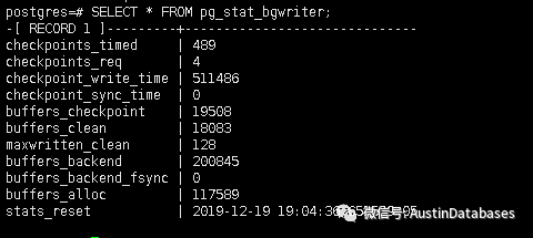 列checkpoints_timing和checkpoints_req显示发生的计划检查点的数量(计时的)和请求的检查点的数量(也称为强制的)。如果checkpoint_req的值很高,则说明max_wal_size值不足。