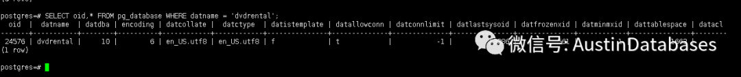 SELECT oid,* FROM pg_database WHERE datname = 'dvdrental';