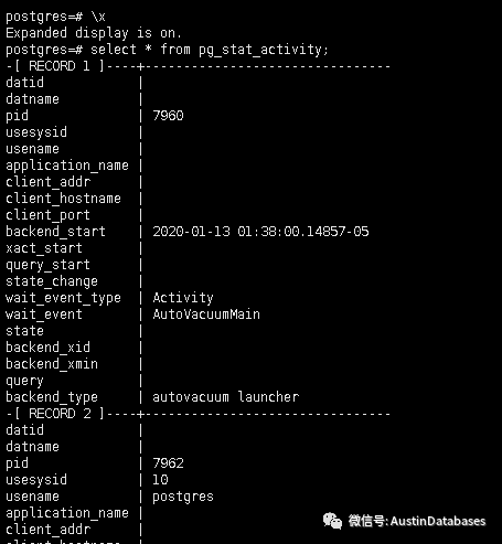 pg_stat_activity视图显示了到数据库的每个连接的一行,以及关于它的一些基本信息。列datname表示连接实际连接到的数据库,pid是数据库主机本身上连接的进程ID, usesysid和usename表示连接的数据库用户。