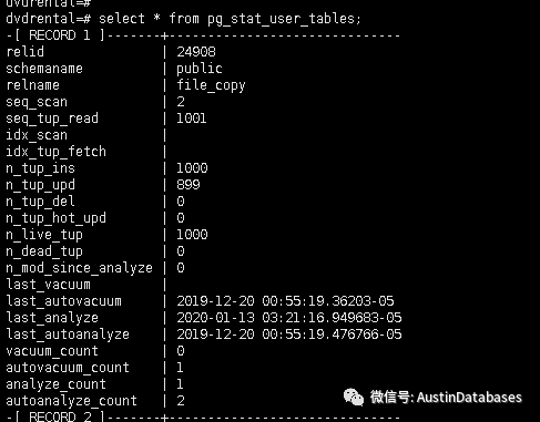 由于更新和删除,可能存在不再是活动数据的死元组,而真空过程最终将释放它们。列' n_tup_ins '和' n_tup_ins '分别跟踪存活和死亡元组的数量。当死元组到达某个点时,将根据自动真空设置启动自动真空。表的维护是通过VACUUM或AUTOVACUUM完成的,统计信息是通过ANALYZE或AUTOANALYZE收集的。接下来的四列包含这些操作最后一次运行的日期:“last_vacuum”、“last_autovacuum”、“last_analyze”、“last_autoanalyze”