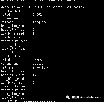 关于用户表的元数据存储在以下两个表中,它们分别对应于系统中创建的每个用户表。表pg_stat_user_tables包含用户对表的访问统计信息,而pg_statio_user_tables包含每个表的I/O统计信息。