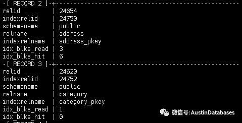 数据可用的两列是“idx_blks_read”和“idx_blks_hit”,表示从磁盘和内存读取的块的数量