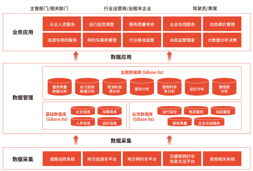 本项目建设内容包括了10大业务系统,涵盖该市出租汽车行业事前、事中和事后的全流程监管与服务,并通过汇聚行业数据资源中心进行大数据分析,为车辆的智能调度等决策提供数据支撑。因此,对系统整体功能规划建设和性能要求都提出了巨大的考验。南大通用通过GBase 8a+GBase 8s组合的方式,使用多套GBase 8s数据库做数据前置,收集数据,并将收集上来的数据传送到GBase 8a集群进行分析,并最终反馈到上层应用,有效满足了客户的多种需求,目前数据量达到上T级,支持多样化数据分类处理,包括出租汽车经营业户、从业人员及车辆的基本信息等基础数据,以及卫星定位位置数据、上下班签到数据、车载智能终端心跳数据、运营数据、服务评价数据、电话调度数据、报警数据、视频数据、环境数据等动态业务数据。
