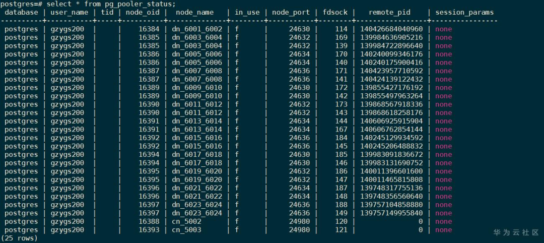 可以连接CN后通过pg_pooler_status查看,如下图: 一般pooler连接池中的连接会非常多,可以按不同字段group by查看某个db pool池中的连接情况,或连往某个node的连接情况,如: